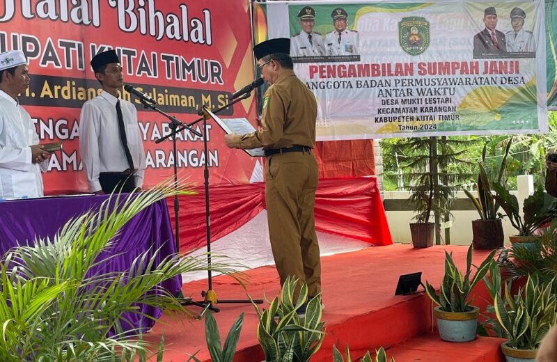 Upnusa, KARANGAN – Bupati Kutim Ardiansyah Sulaiman melantik dalam kegiatan pengambilan sumpah janji Anggota BPD Desa Mukti Lestari terpilih antar waktu, di Kafe Kanad Kecamatan Karangan Dalam, Senin (20/5/2024). Kegiatan ini turut dirangkai dengan silaturahmi dan halal bihalal Bupati Kutim Ardiansyah Sulaiman bersama masyarakat Karangan Dalam.