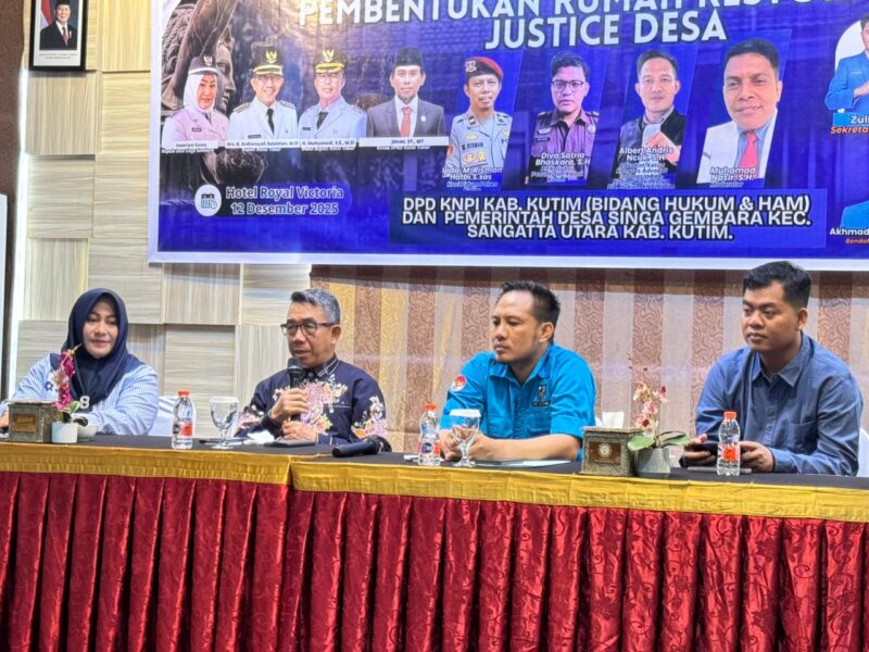 Upnusa, SANGATTA – Pemerintah Desa Singa Gembara berkolaborasi dengan DPD KNPI Kutai Timur meresmikan pembentukan Rumah Restorative Justice (RJ) Desa Singa Gembara. Peresmian tersebut dirangkai dengan kegiatan penyuluhan hukum yang digelar di Cafe Maloy Hotel Royal Victoria, Jumat (12/12/2025).