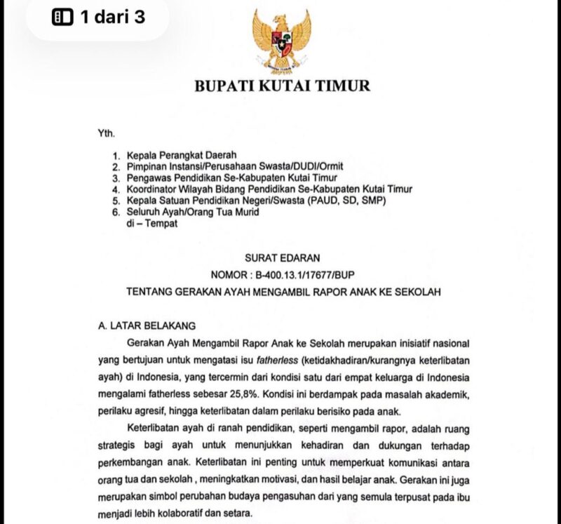 Upnusa, SANGATTA – Pemerintah Kabupaten Kutai Timur (Kutim) kembali menegaskan komitmennya dalam memperkuat peran keluarga melalui peluncuran gerakan yang mengajak para ayah terlibat lebih aktif dalam pendidikan anak. Melalui Surat Edaran Bupati Kutai Timur Nomor B-400.13.1/17677/BUP tertanggal 8 Desember 2025, Pemkab secara resmi mengimbau para ayah untuk hadir langsung ke sekolah saat pengambilan rapor anak.